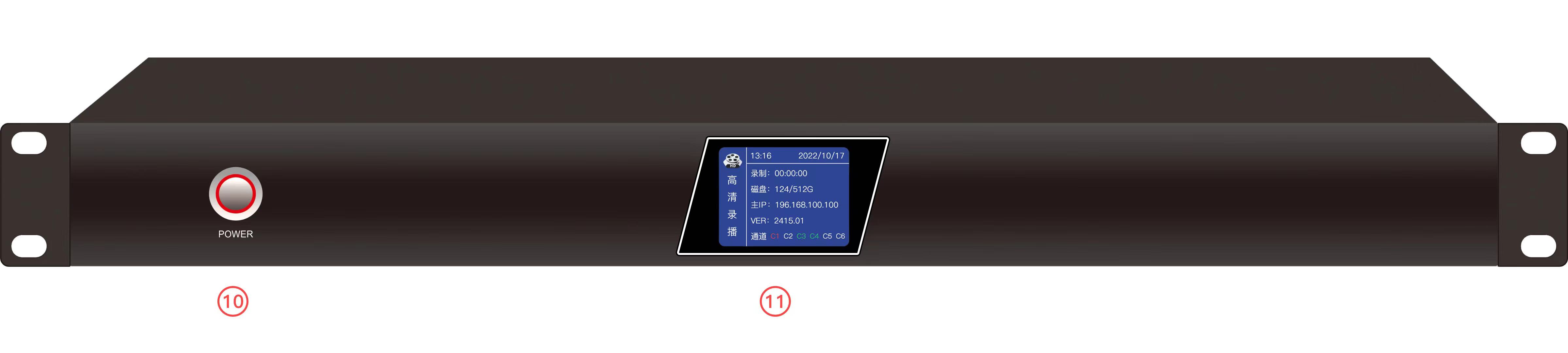 11。主机的前面板配备了LCD屏幕,该屏幕支持显示徽标,磁盘空间,记录状态,IP地址,固件版本和频道状态等信息,并实时管理设备控制。为了确保清晰显示,LCD屏幕的大小不少于2英寸